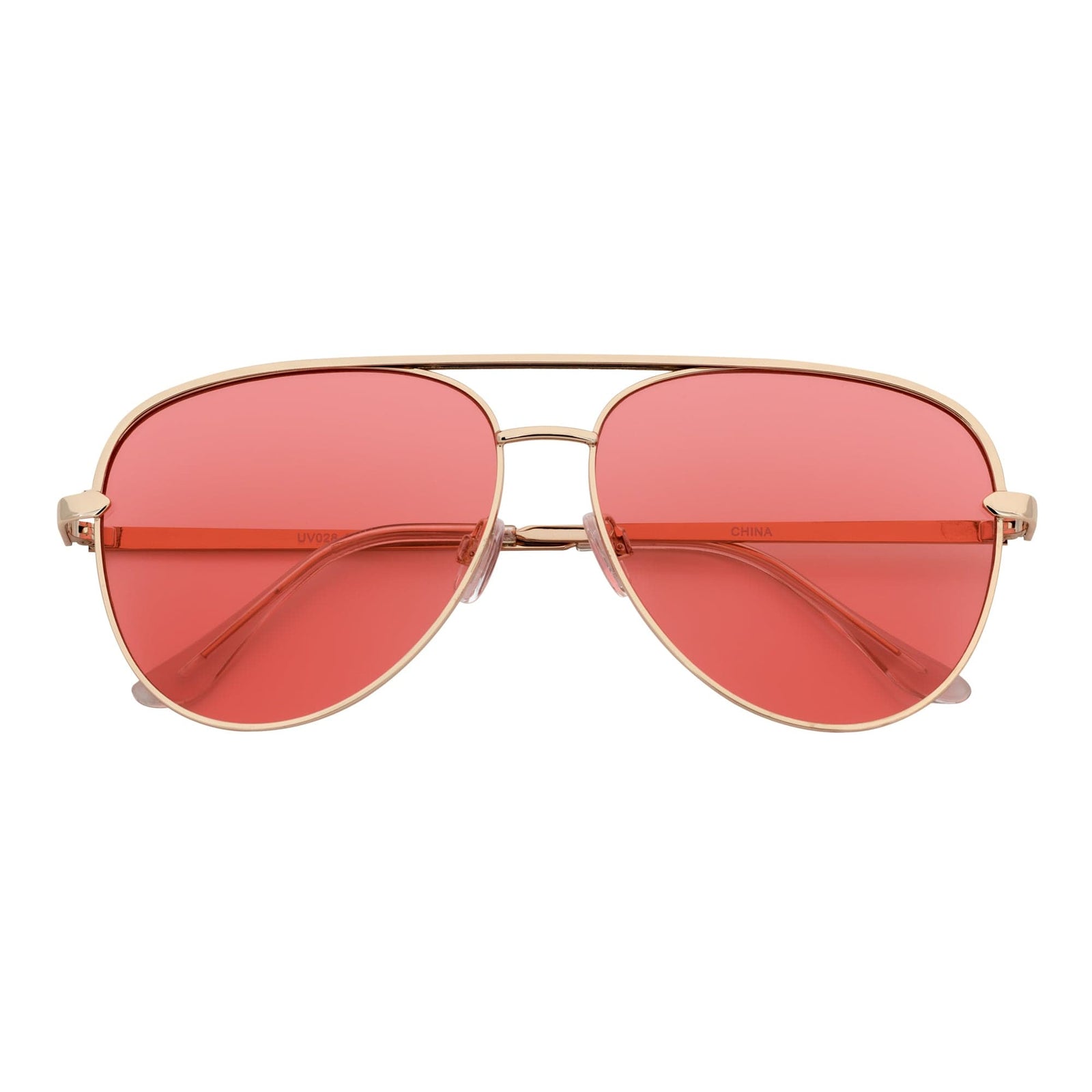 Woman wearing red cat eye sunglasses.